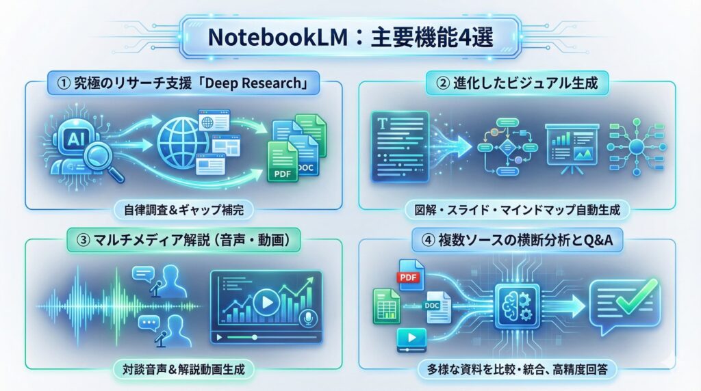 2026年現在のNotebookLMは、主に以下の4つの強力な機能を提供しています。