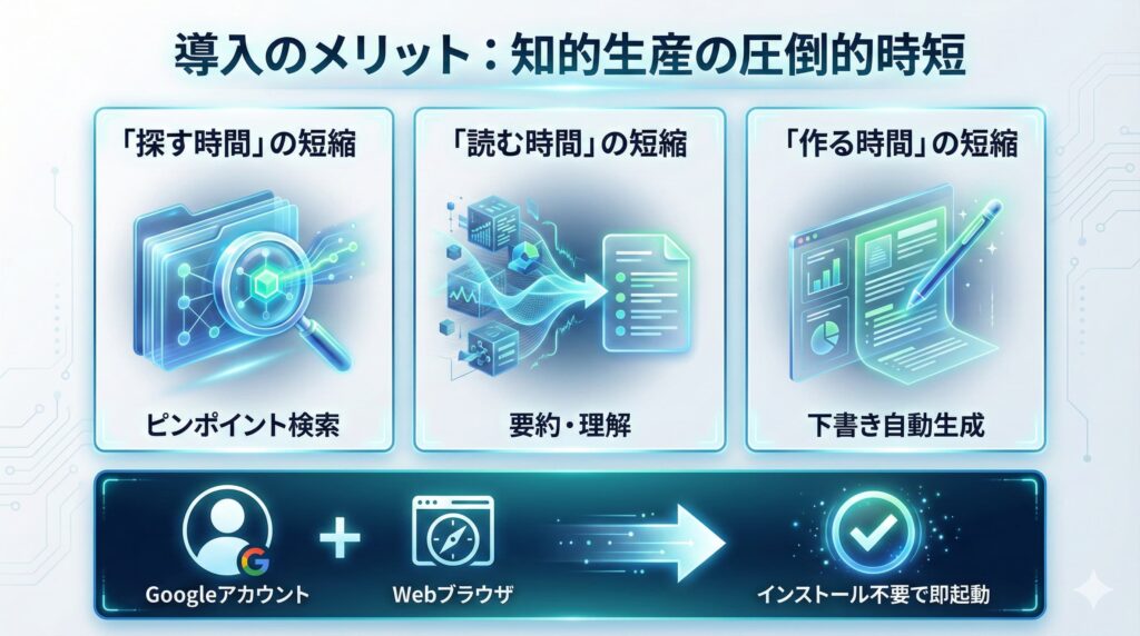 「探す時間」の短縮: フォルダの奥底にあるPDFや、長い動画の中の「あの情報」を、AIがピンポイントで探し出してくれます。