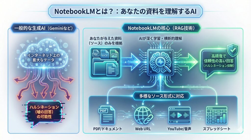 NotebookLMの最大の特徴は、「あなたが与えた資料だけを根拠にする(RAG技術)」点です。これにより、AI特有の「ハルシネーション(嘘の回答)」を劇的に抑え、「このPDFの○ページにこう書いてあります」といった、高精度で信頼性の高い回答を得ることができます。