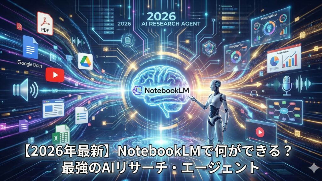 2026年現在、NotebookLMは単なる「要約ツール」の域を超え、情報収集から分析、視覚化、そしてプレゼン資料作成までを自動化する、あなただけの「AIリサーチ・エージェント」へと進化を遂げています。