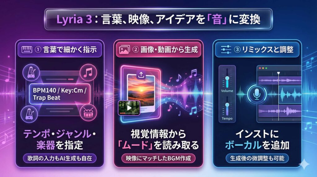 Lyria 3は、単に「テキストを音にする」だけではありません。多様な入力方法を組み合わせることで、クリエイターのインスピレーションを多角的に刺激します。