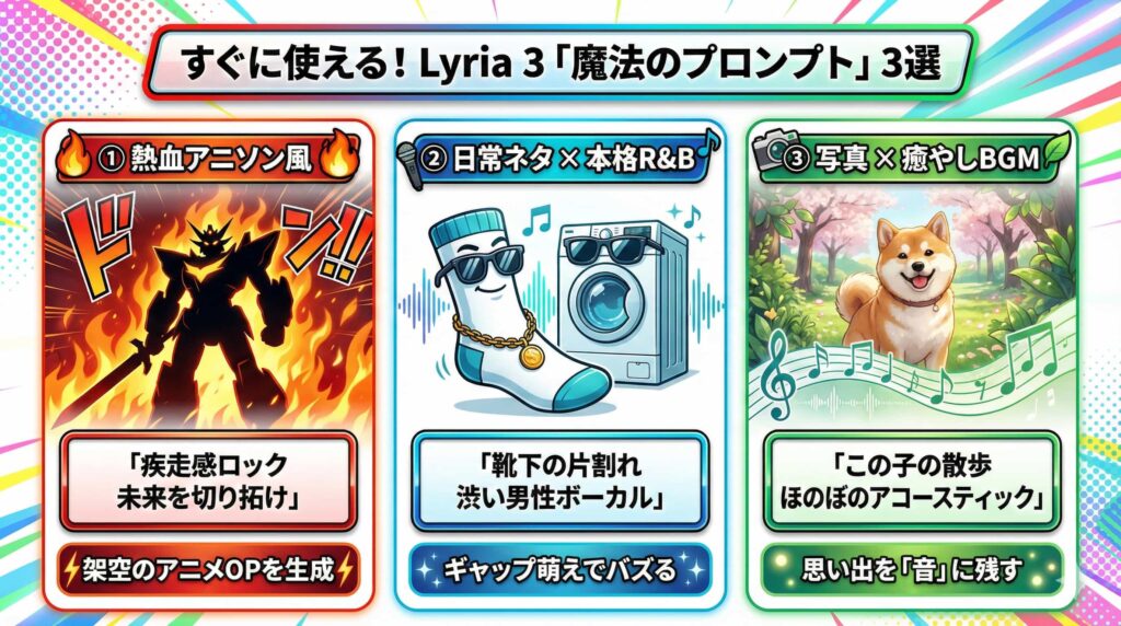 Lyria 3のリリース直後から、X(旧Twitter)などのSNS上では、ユーザーによる実験的な投稿が相次ぎトレンドとなっています。特に反響の大きい、具体的なプロンプトのパターンをいくつか紹介します。