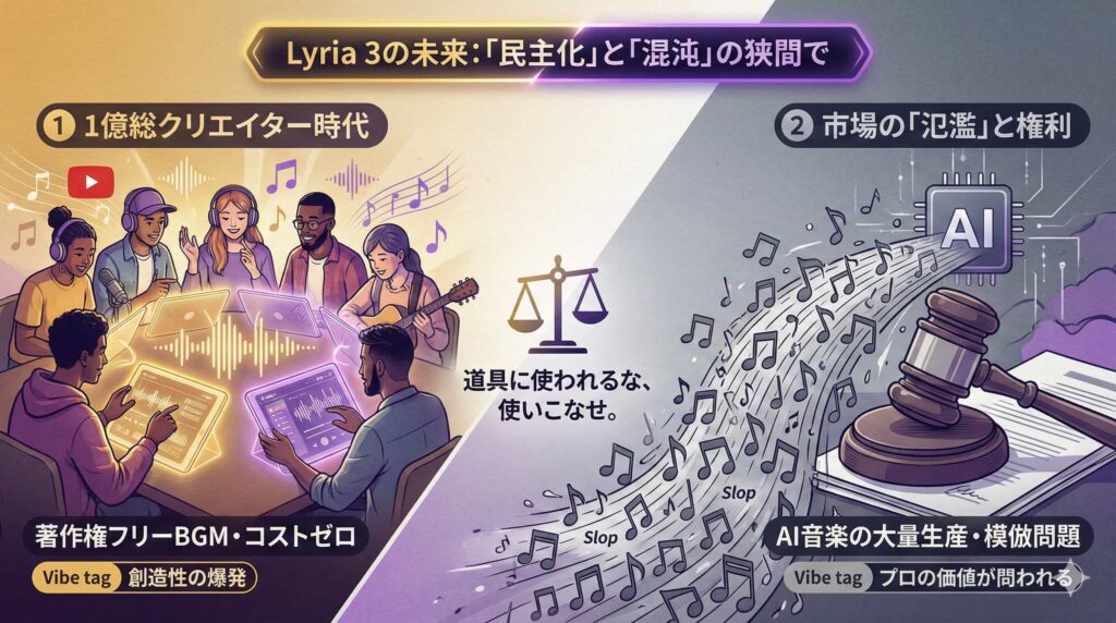 Lyria 3の登場は、「音楽制作の民主化」をさらに加速させる一方で、新たな議論も呼んでいます。