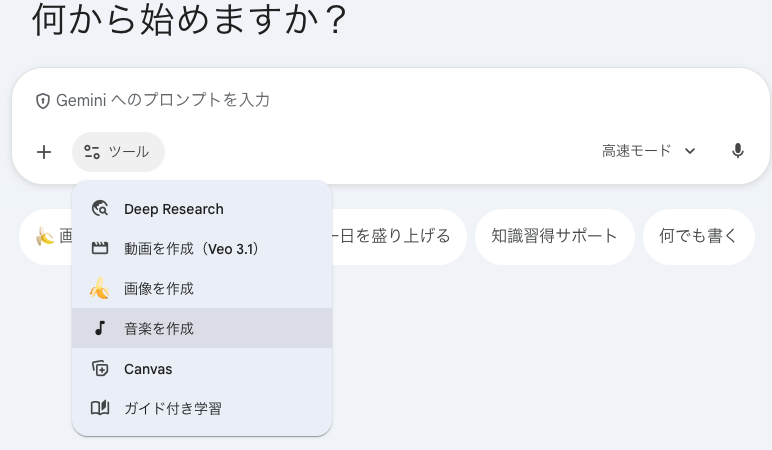 Geminiのチャット画面で、以下のいずれかの方法で音楽作成をスタートします。