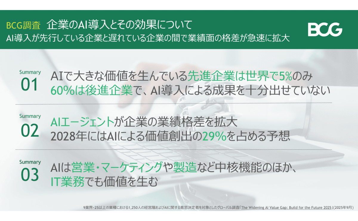 2025年10月23日、経営コンサルティングファームのボストン コンサルティング グループ(BCG)は、企業のAI導入とその効果に関する衝撃的な調査結果を発表しました。