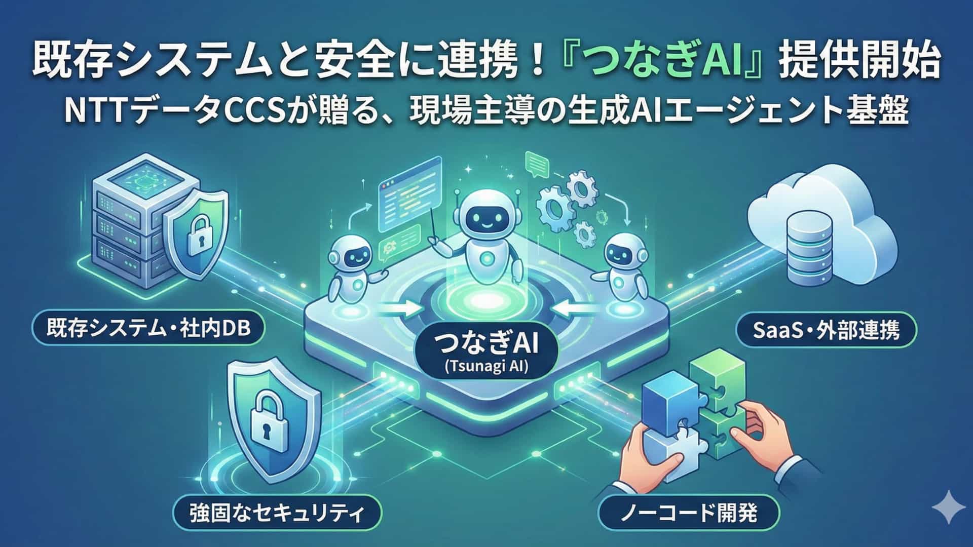 2026年2月13日、株式会社NTTデータCCSは、企業内の既存システムと安全に連携し、業務を自律的に実行する生成AIエージェント基盤「つなぎAI」の提供を開始しました。