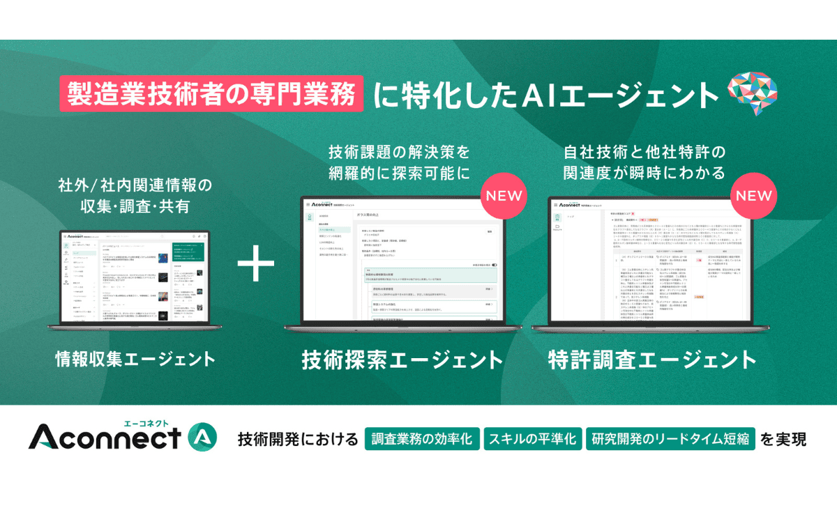 『Aconnect』に今回新たに追加されたのは、「技術探索エージェント」と「特許調査エージェント」です。これらは、汎用的なAIとは一線を画し、製造業の専門業務に特化した高度な能力を持っています。