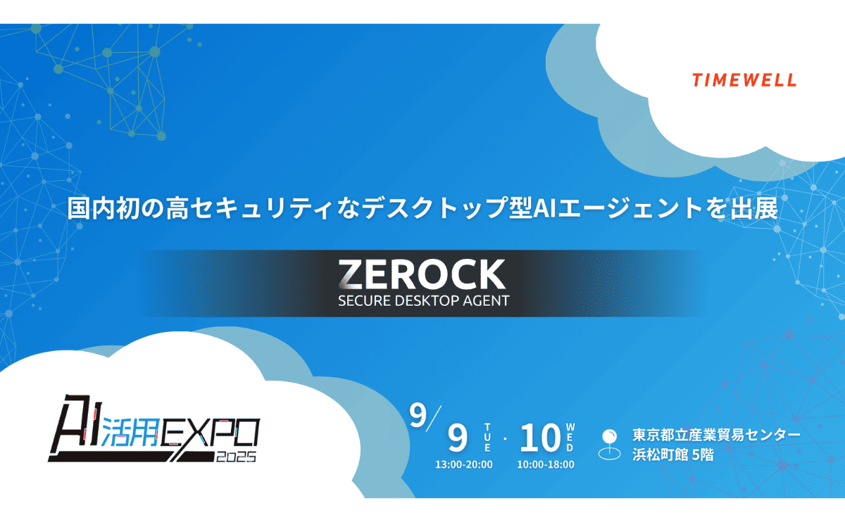 株式会社TIMEWELLは2025年9月3日、同社が開発する高セキュリティAIエージェント「ZEROCK(ゼロック)」の新機能を、9月9日から開催される「AI活用EXPO2025」にて展示することを発表しました。