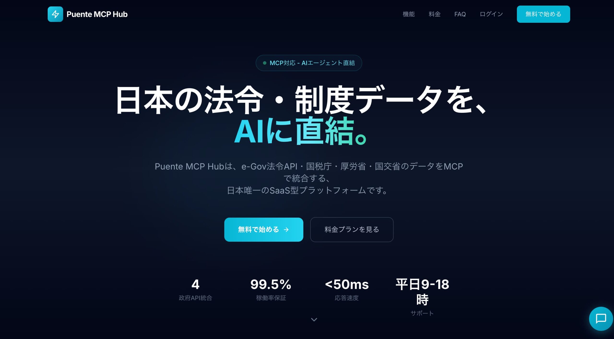 Puente MCP Hubは、複数の公的APIをクラウド経由で束ねたSaaS型のプラットフォームです。ブラウザベースで管理が完結し、法令検索から不動産法規まで幅広いデータへ安全かつ高速にアクセスできる環境を提供しています。