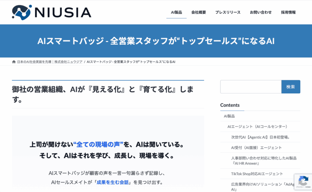 | AIスマートバッジ | ニュウジア | ・ウェアラブル録音 ・日報自動生成 | 要問い合わせ | ・訪問/店舗営業の効率化 ・報告業務ゼロ化 |