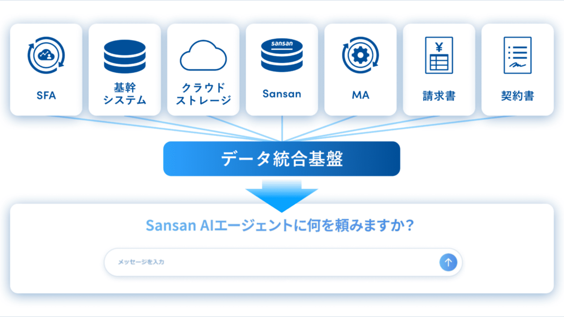Sansan AIエージェントは、100万件以上の企業情報を有する「Sansan」のデータベースに加え、企業内のSFA、メール、議事録などの多様なデータを統合し、AIが横断的に検索・要約して回答するソリューションです。